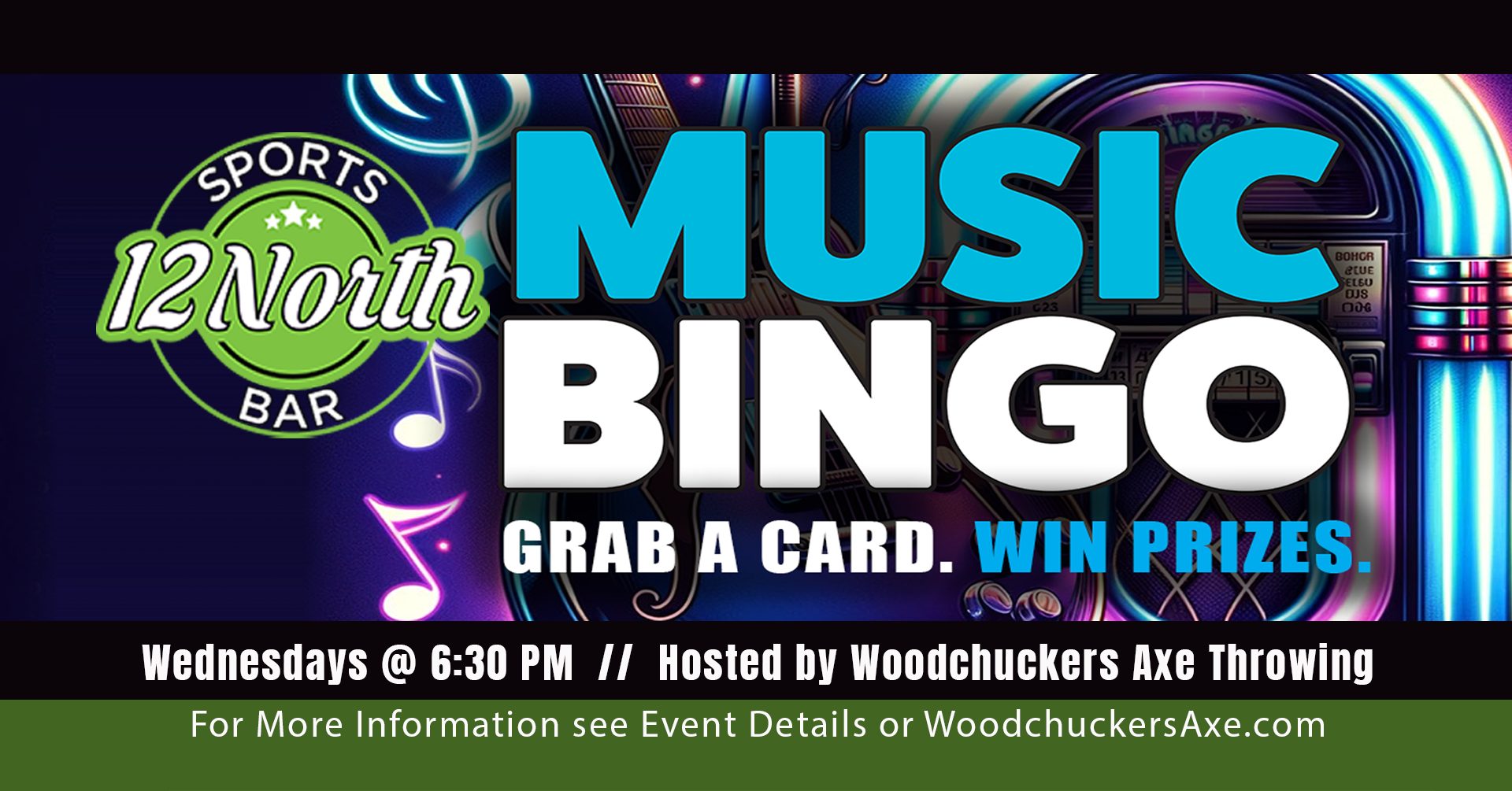 Join us at 12 North Sports Bar for Music Bingo, hosted by our friends at Woodchuckers Axe Throwing — where great tunes meet great times!